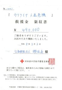 今回はチャリティーコンサートであり、入場料収入の全額、上智大学グリーンクラブOB合唱団の皆様からのご寄付、オクサーナ・ステパニュックさんのCDの売り上げの一部を合わせた49万円を、ウクライナ人道支援金として、日本赤十字社に寄付をいたしました。
